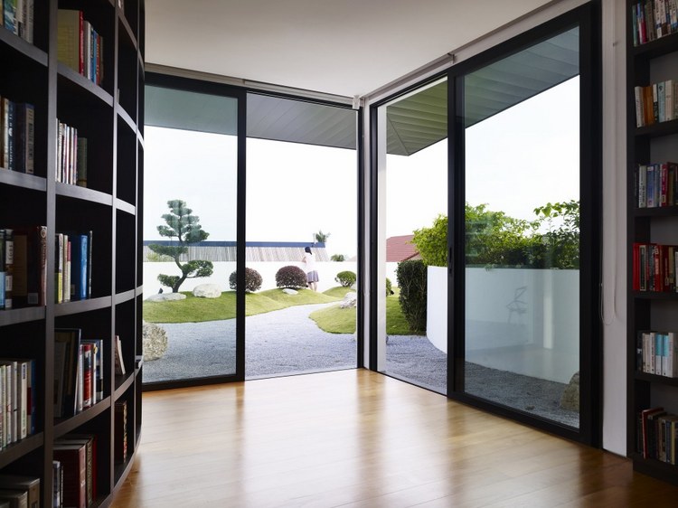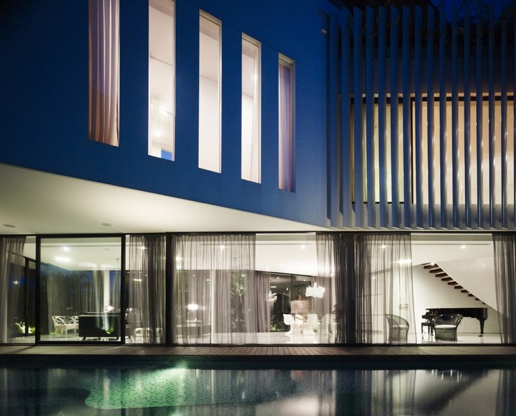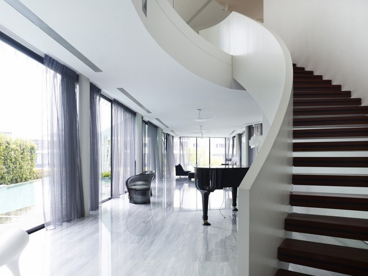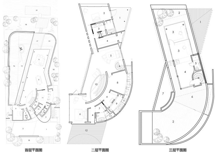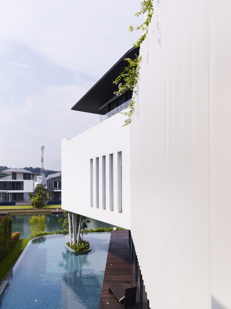 別墅設計,13 Cove Grove別墅(13 Cove Grove)13 Cove Grove別墅建在一處狹長的基地上,正對著一小片水域。為了使居住者最大化地欣賞到水域的風景,設計團隊將別墅裝修設計成一個類似回力鏢的體量,從而使臥室正面像這片美景。這樣的布局安排,使這個游泳池的一邊一直延伸至一層的一側。另外,團隊還在一層的主要區域設計了一個連續性的空間,進入這里后,人們可以看到筆直的水域獲得更加連續的視野。與水域相連的是一個線性的木質甲板設計,一直從房間內部延伸出來,視覺上增加了房屋的面積。除了基本的回力鏢設計,團隊至少還采用了另外兩種布局的變體,從立面設計看,設計師以完全不同的方式設計了不同兩側的回力鏢體量。面向街角的一層,將透明與封閉設計交叉使用,而二層則完全使用了實體墻進行立面設計??肯蛩虻囊粚觿t采用了相對開放的透明玻璃設計,增強了可視度。一層主要作為公共活動空間,二層為臥室區域,而與屋頂花園相連接的三層則主要作為工作室使用。
