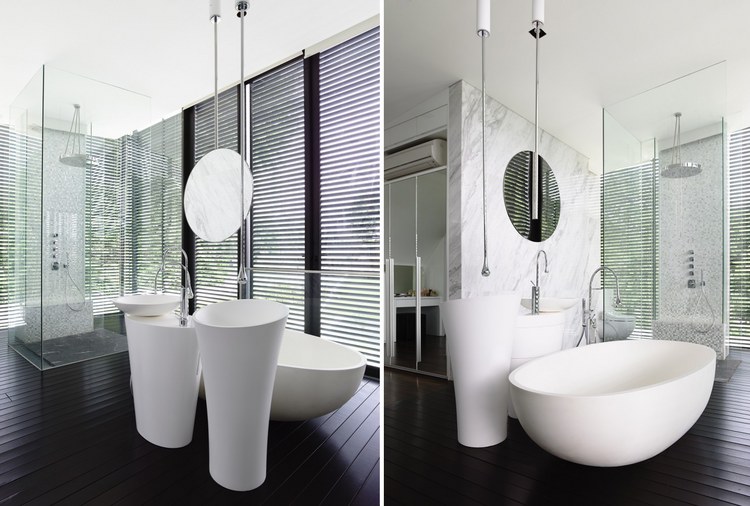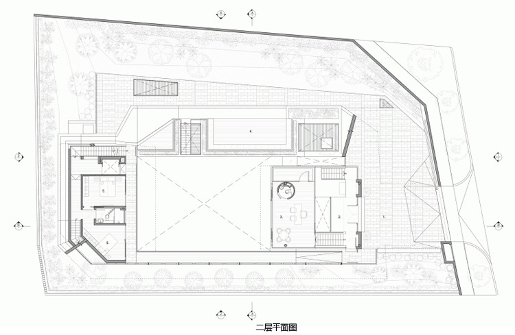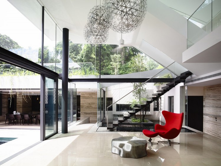 別墅設(shè)計(jì)安德魯路私人別墅(Andrew Road)設(shè)計(jì)師將與街面水平的這一層打造為封閉式的樣式,從入口處可以看到中央院落巨大的游泳池,四面各功能房采用了透明玻璃設(shè)計(jì),高于街面水平層的二三層樓的屋頂略大于房屋,如鍋蓋一樣將房屋罩在下面。長條式的格柵落地玻璃窗設(shè)計(jì)與其他部分的設(shè)計(jì)相呼應(yīng),體現(xiàn)了整個(gè)別墅簡明的風(fēng)格樣式。D字型的內(nèi)部空間設(shè)計(jì)將房間主要設(shè)置在半弧形的位置,過道和樓梯則位于D字形垂直的豎向位置,起到了隔離噪音等作用。