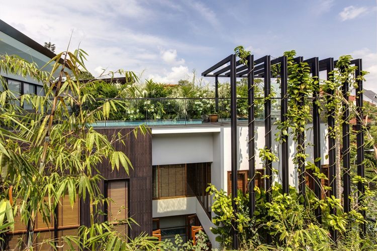 另外,業主對住宅的花園和綠化一直很重視。前兩所住宅中種的樹已經超過木陽臺了,這次在垂直的木棚架上種上了很多攀援植物,可以一直長到屋頂的游泳池。連住宅的浴室也都面向花園,能看到蔥郁的花和蝴蝶飛舞,這是一個真正的垂直花園別墅。