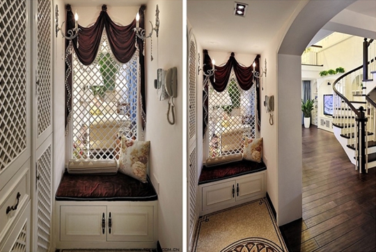 戶型的客廳陽臺也是整個家居中的一大看點,通過溫和的色調(diào)來提升空間的舒適度。華麗的窗幔以及沙發(fā)、抱枕的搭配,自然中流露出一股清新、怡人的生活氛圍。