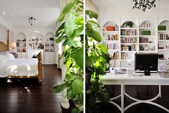 純白色的主臥設(shè)計帶有書房功能,主桌的款式也是專門定做的,雙人位的設(shè)計是方便兩人同時使用,書柜造型是借用了鄉(xiāng)村風(fēng)格中的拱形門造型。床的一側(cè)也是一個裝飾柜,所不同的是中間造型做了一個壁爐,冬天取暖很實用的。