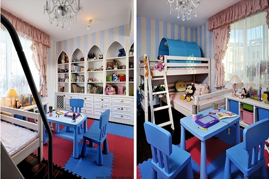 二樓的兒童房設(shè)計有點偏向于清爽型的地中海風(fēng)格,裝飾柜用很夢幻的迪斯尼尖頂造型。整面墻都是做了儲物設(shè)計,藍白條紋的背景墻以及粉紅色的窗簾顏色,柔和型的搭配很適宜兒童房顏色的搭配法則。