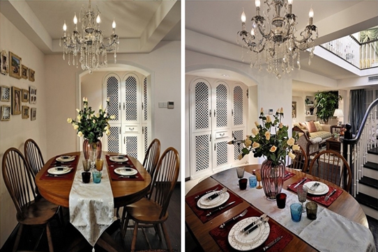 餐廳位置位于二樓上樓處,站在餐廳的一角剛好可以看到在整個別墅的大致結(jié)構(gòu),客廳,以及上二樓的樓梯位置 。餐廳與廚房也是通過鏤空型的門隔開,頗有幾分歐式風(fēng)格的優(yōu)雅之美。